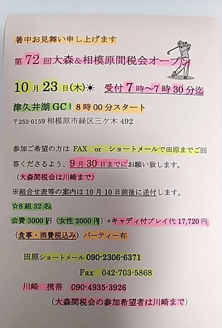 10/23(木)8:00開始 津久井湖GC | 会員 | 大森&相模原間税会オープン【ご案内】 | FAX:042-703-5868(田原) |