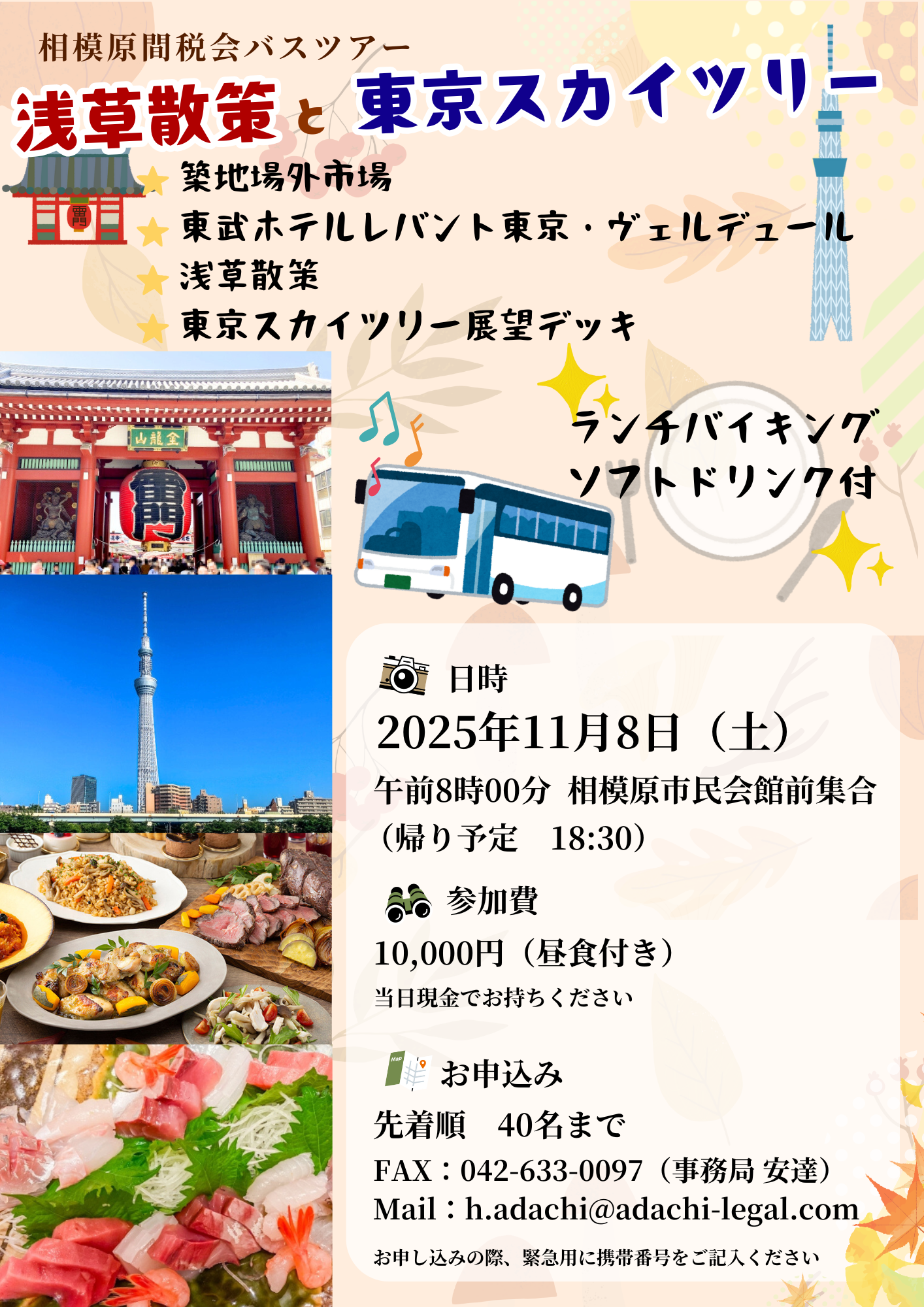 11/8(土) 8:00相模原市民会館前集合 | 会員 | バス研修旅行【ご案内】 築地・浅草方面 参加費:10,000円 | 事務局(安達) ※ホームページでお申し込みの方は10/24までにお願いいたします。 |