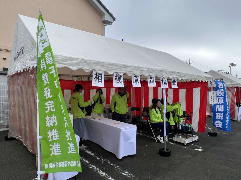 相模原間税会は、(株)セレモア さんにご協力いただき、6日にセレモア相模原本店の駐車場にてブースを設置させていただきました。